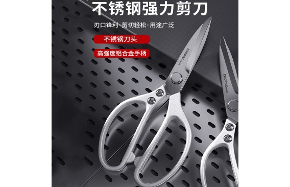 不锈钢强力剪刀:8英寸,产品尺寸:210*92*16mm;刀片材质不锈钢(3CR13),刀片厚度3.6mm,有热处理,硬度46-49HRC;手柄材质铝合金,厚度14mm;重量:185.3g