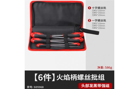 SD5969/12件螺丝批组套:规格12pcs, 组成明细:火焰柄螺丝批*2:刀杆3*150mm,一字(SD6610-1);火焰柄螺丝批*2:刀杆3*150mm,十字 (SD6610-2);火焰柄螺丝批*2:刀杆5*150mm.一字(SD6620-1);火焰柄螺丝批*2:刀杆5*150mm.十字(SD6620-2);火焰柄螺丝批*2:刀杆6*150,一字(SD6603-1);火焰柄螺丝批*2:PH2*150(SD6603-2);材质:S2,刀杆镀亚光,头部发黑带强磁,硬度54-56HRC;净重:775G;