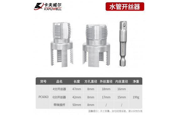 水管开丝器:开丝器A3钢材质,本色,无热处理,4分开丝器,长度47mm,外丝牙长18mm,内丝牙长16mm;6分开丝器,长度42mm,外丝牙长17mm,内丝牙长15mm;中间带方孔(方孔对边直径8mm),搭配带珠接杆,材质50BV30,无热处理,带珠接杆长50mm,六角对边尺寸7mm