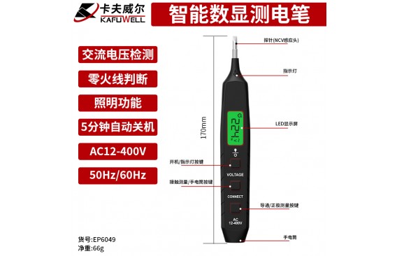 数显测电笔:工作电压:AC12-400V,交流电压:50/200Hz,整体长度170mm,刀杆外露长度17mm。外壳材质ABS,整体黑色,产品带显示屏,笔夹设计,前面带LED灯,尾部手电筒设计,2节1.5V AAA电池;净重:50.9g;
