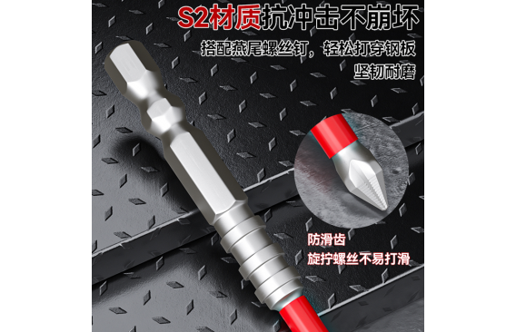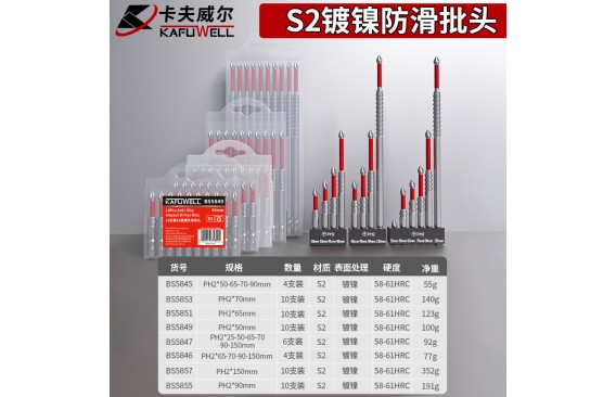 4支装S2镀镍防滑批头:4支装PH2十字防滑批头: 柄部直径6.35MM,长度规格:50MM,65MM,70MM,90MM;材质S2,表面处理镀镍,硬度55-58HRC,产品头部做防滑齿,净重:55G