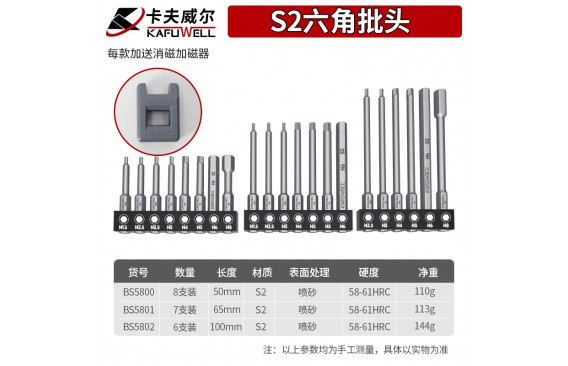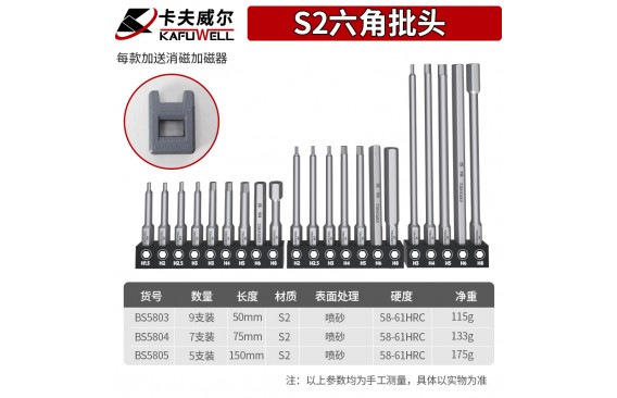 卡夫威尔S2强磁性六角批头系列 规格齐全 高扭矩 耐磨耐用 强磁吸附 防止打滑 适配各类工具的批头套盒系列
