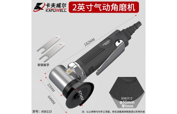 气动角磨机:2"(50mm),砂轮片规格:直径50mm,厚度5mm,孔径10mm;机身总长170mm,高62mm,机头宽26.5mm,防护罩外径57mm,厚2mm;铝机身喷塑黑,防护罩PVC材质,上下压板45#钢,内部齿轮20CrMo,硬度52-56HRC;性能参数:自由转速15000rpm,工作气压6-8kg/m²,1/4"进气口;主轴螺纹M6;配件:砂轮片1片(安装在机器上),铁扳手一对,进气接口1个