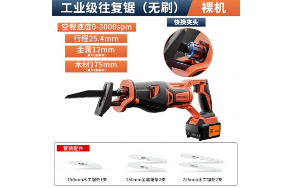 PA4510H:橙黑配色,黑色全新TPE料,橙色全新尼龙料;工作电压20V,空载速度:0-3000spm,行程25.4mm,最大切割厚度:木材175毫米,金属12毫米;带快速换刀夹头,2档刀片摆动可调,带LED灯,安全保护按钮,无极调速开关,电机符合GS,CE,EMC标准 ;单个裸机搭配一根金属锯条、一根木工锯条、一份中英文说明书
