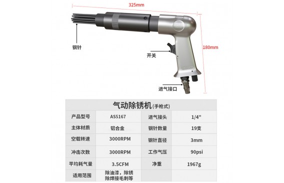 迷你除锈机:空载转速 Free Speed:4000rpm;平均耗气量 Air Consumption:4.0cfm;进气接口 Air lnlet Size:1/4" ;工作气压 Working Pressure:90psi ;行程Stroke:6-7mm;冲针数量Needle:12针