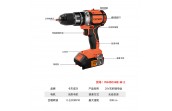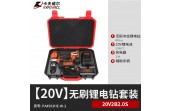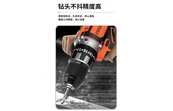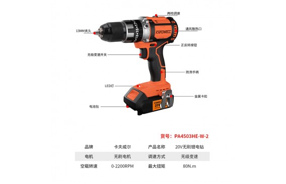 20V无刷双速带冲击锂电钻:橙黑配色,黑色全新TPE料,橙色全新尼龙料, 带金属卡扣;工作电压20V,13mm金属夹头,机械双速调节,空载速度:0-550/0-2000RPM,冲击频率:0~8800bpm/0~32000bpm; 20+3扭力设置,正反转功能,无极调速开关,最大值扭矩80N.m,LED工作灯,测试符合GS、CE、EMC标准。