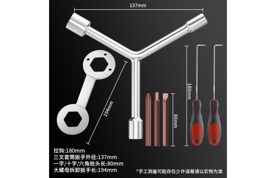 洗衣机拆卸工具OT6273:7PCS,H5六角批头1支,8mm一字批头1支,PH3十字批头1支,材质均为S2,表面古铜色,整理热处理,硬度56-58HRC;钩子1对,手柄红黑配色PP+TPR,钩子总长180mm,勾子长度9mm,45#碳钢,整体热处理,表面镀铬,勾子硬度43-46HRC;三叉套筒扳手,规格8-10-12mm,Q235材质,表面镀锌,无热处理;离合器扳手1个,规格36/38mm,Q235材质,表面镀锌,无热处理;重量552g